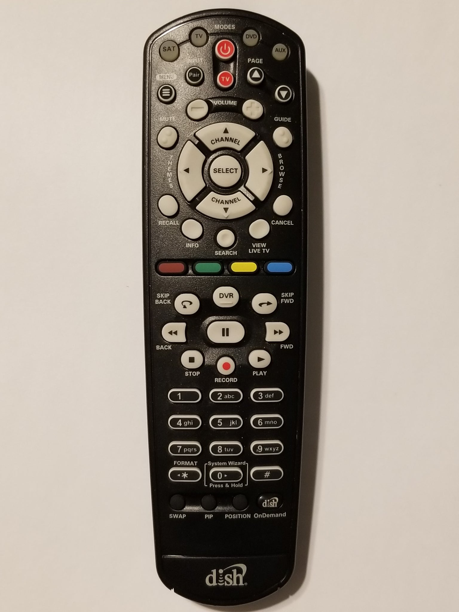 This black Dish Network 186228 remote has buttons for advanced features such as PIP (Picture in Picture), swap, position, and on demand.