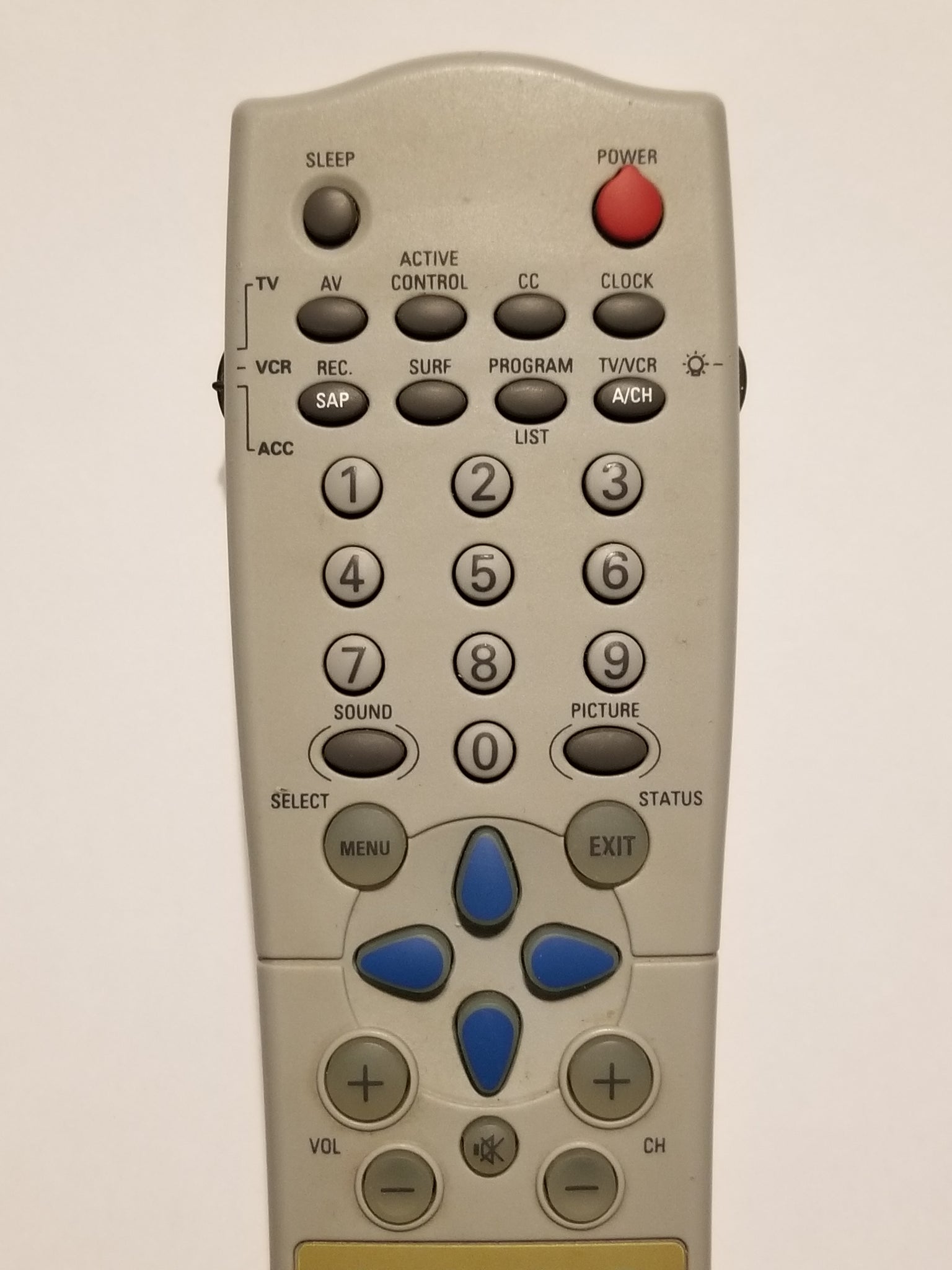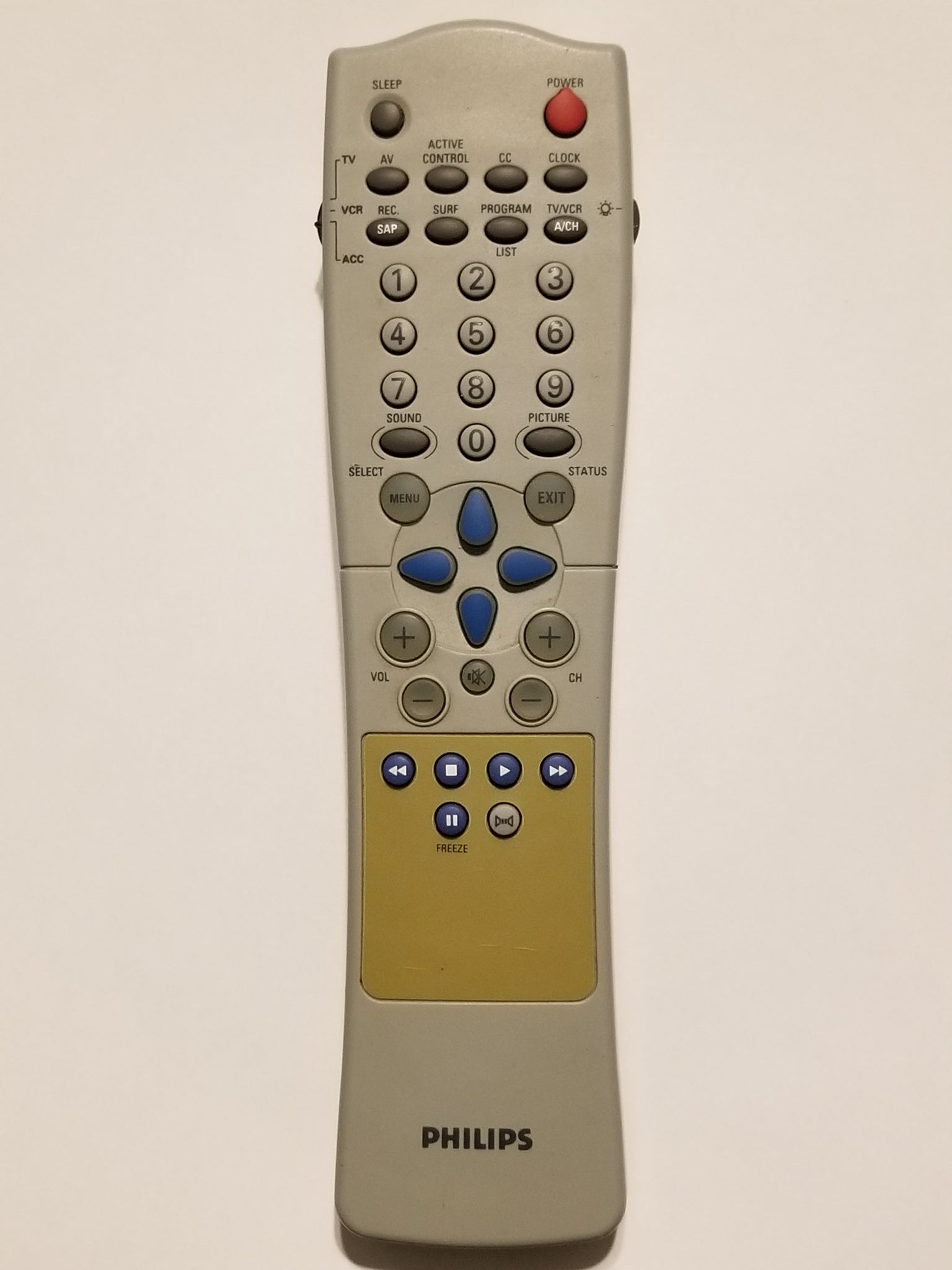 This gray Philips Television 3139 128 76712 HV49 replacement remote control has buttons for AV, SAP, active control, CC, surf, sound, picture, freeze, mute, and more.