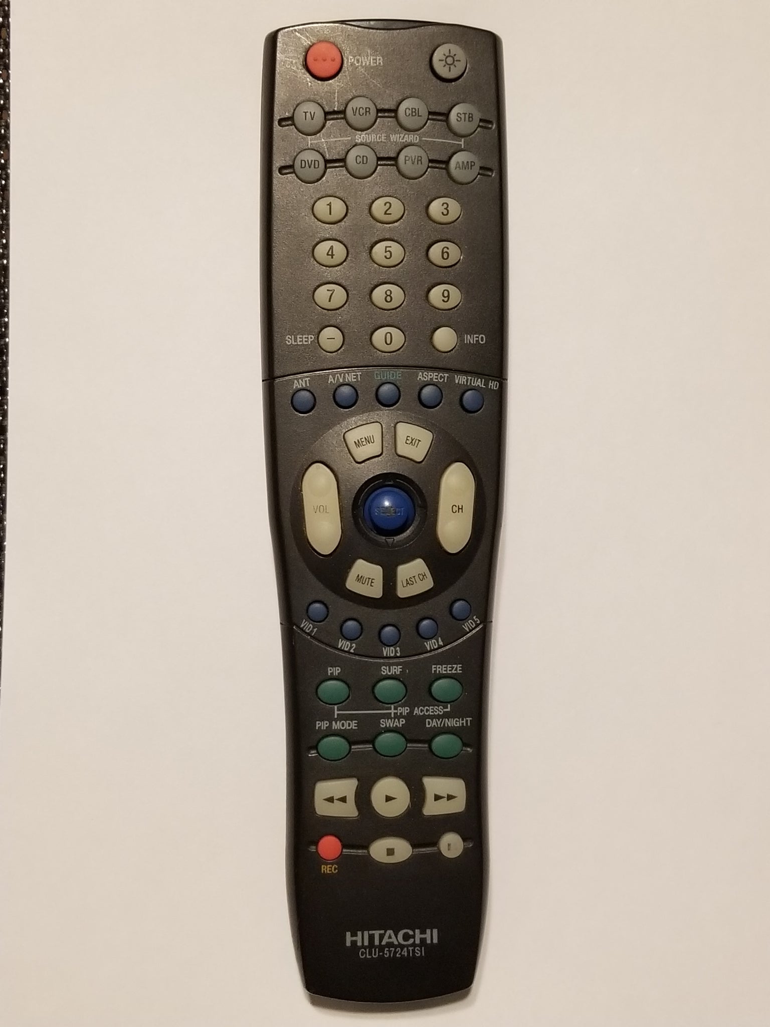 This black Hitachi CLU-5724TSI replacement remote has controls for the source wizard to select between TV, VCR, Cable, SB, DVD player, CD, PVR, and AMP. It also has buttons for the unusual features such as freeze, PIP (Picture in Picture), Swap, and day/night mode.