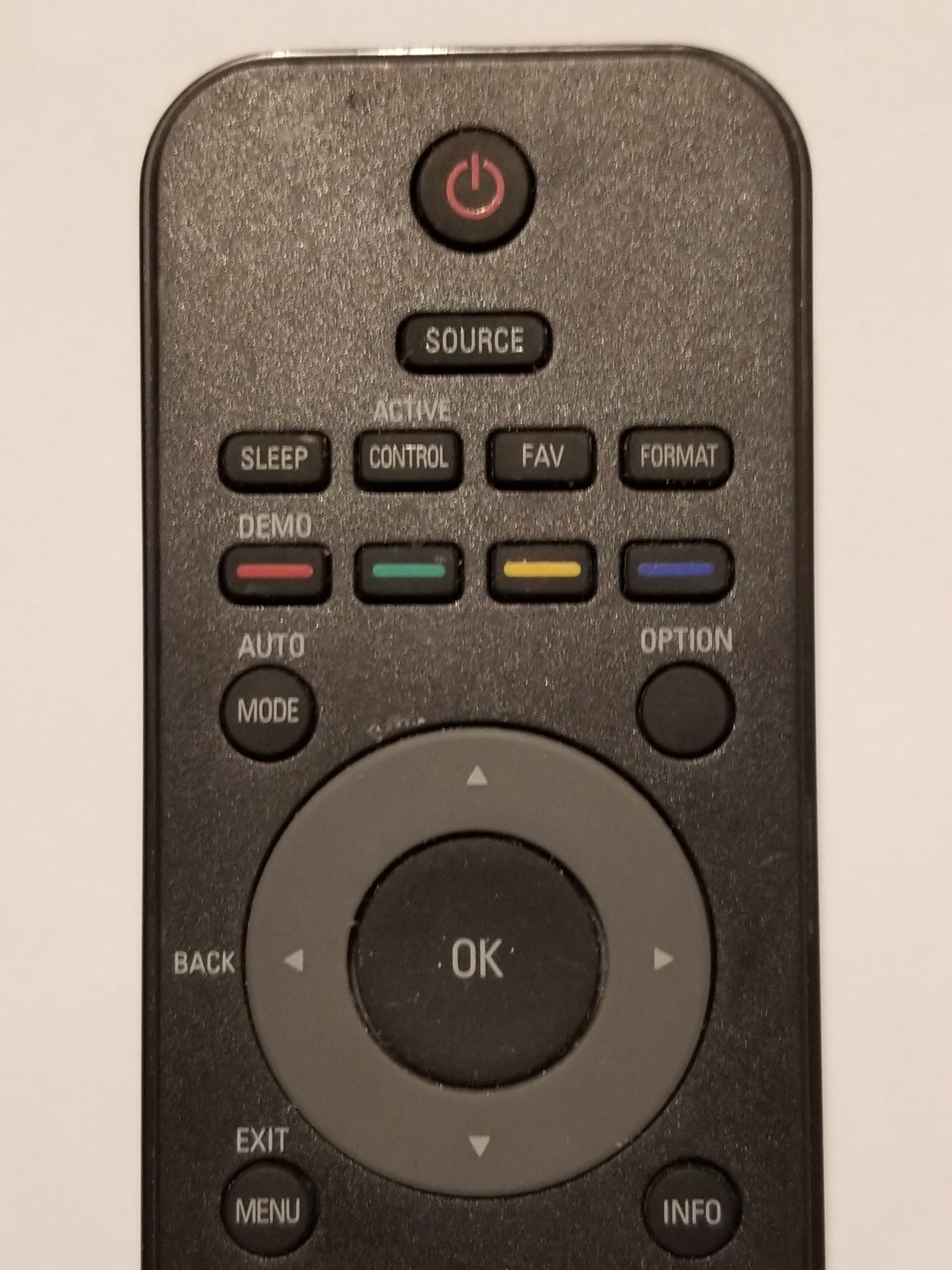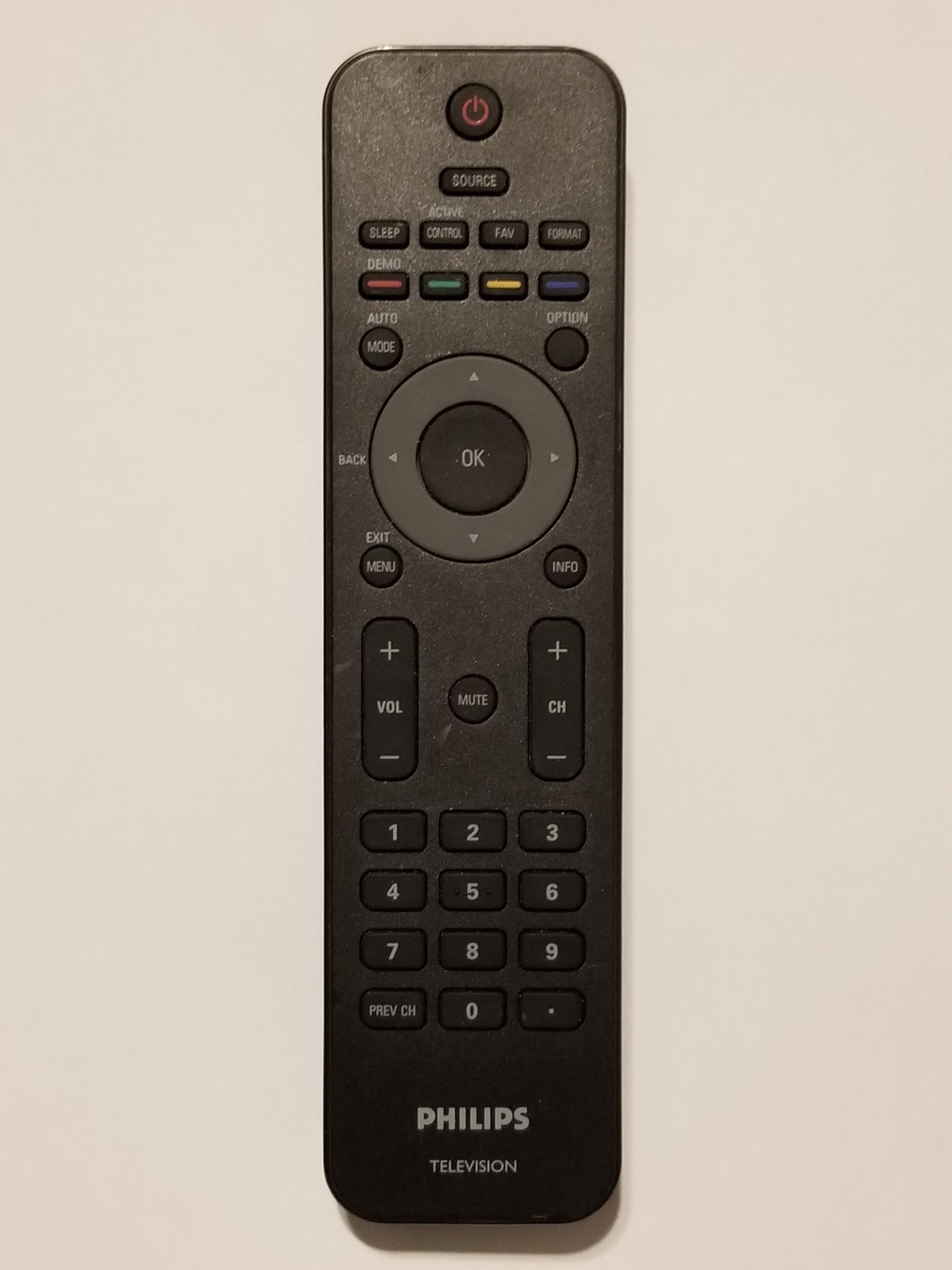 This black Philips Television 2422 549 01817 replacement remote control has buttons for Active Control, Format, Source, Demo, volume up and down and channel up and down.