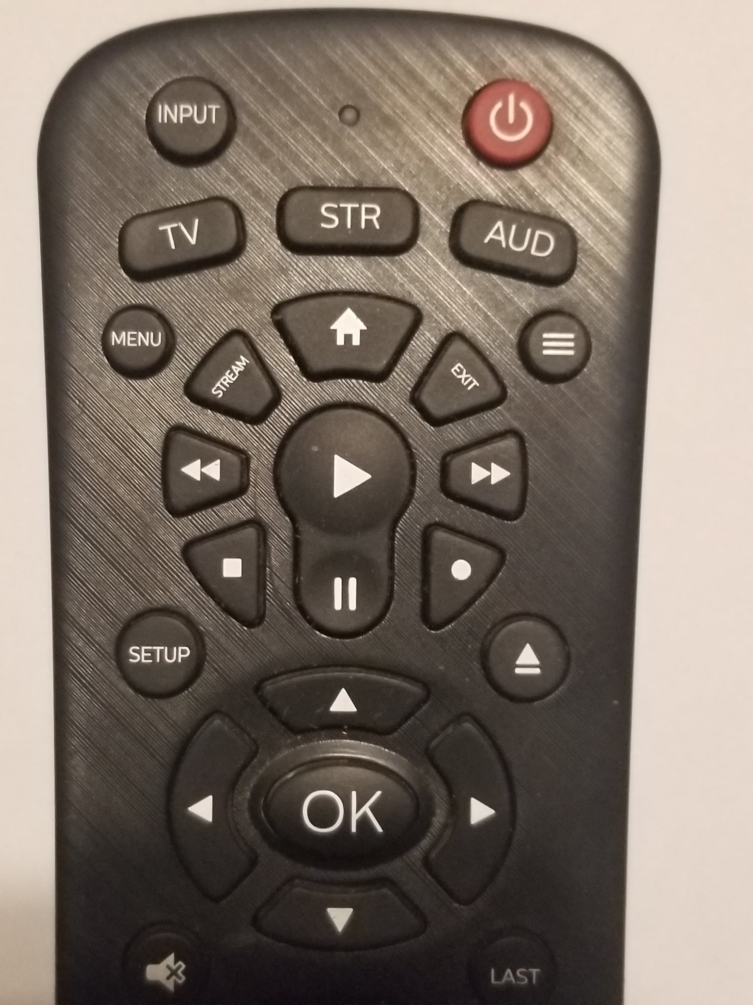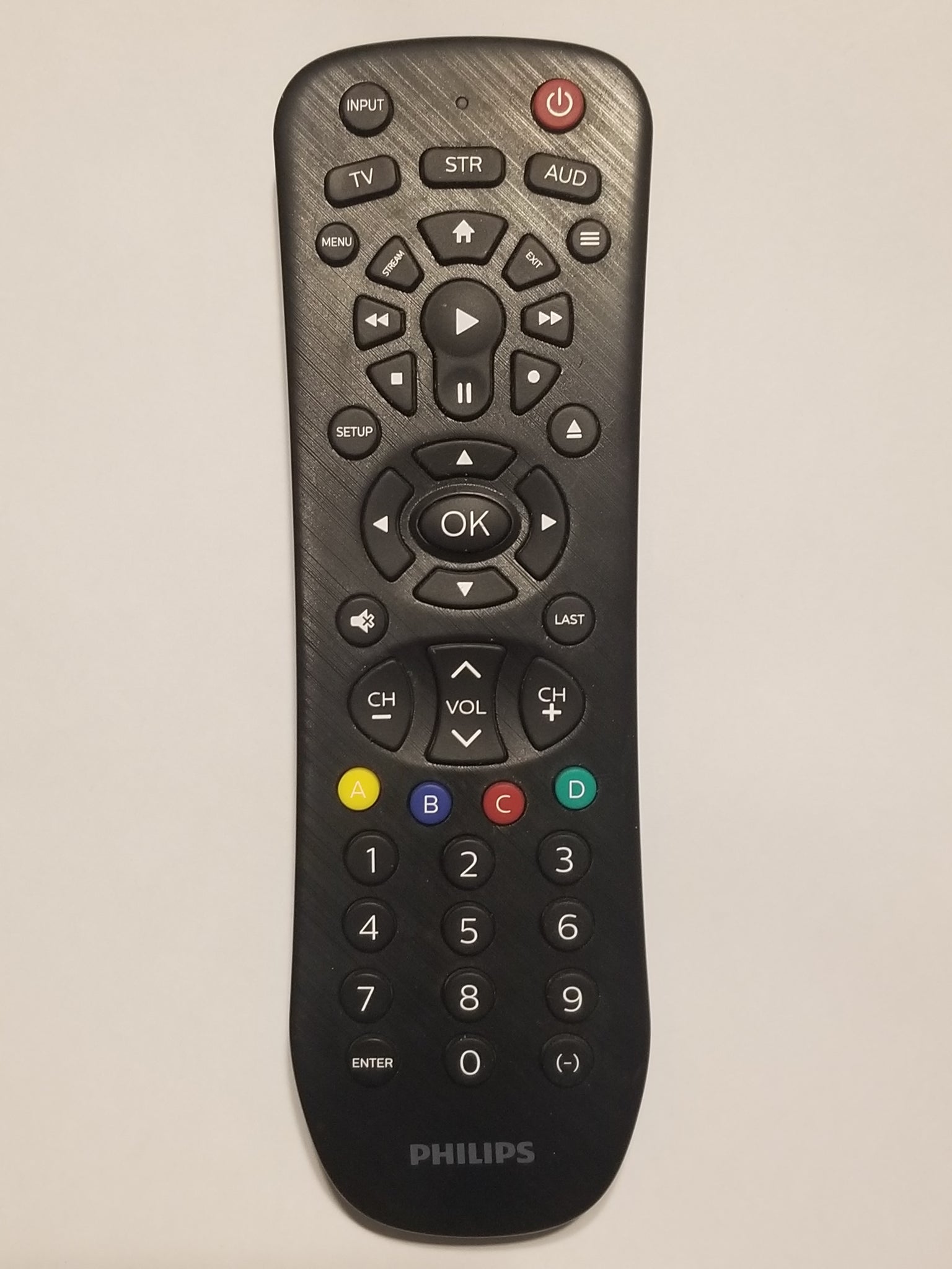 This black 4517-1 SRP9232D/27 6117 CL5 2117 Philips replacement remote control has buttons for STR, AUD, input, TV, stream, and setup.