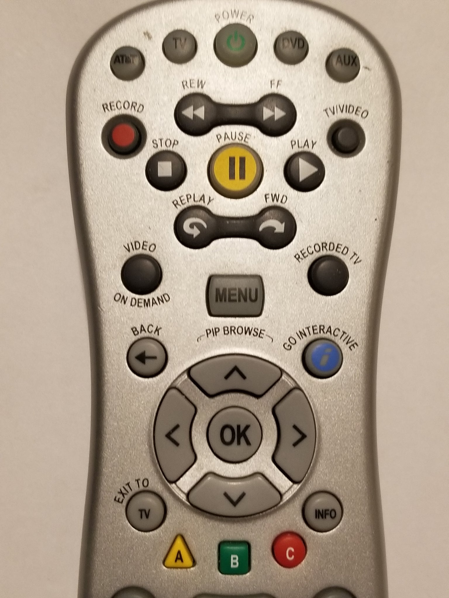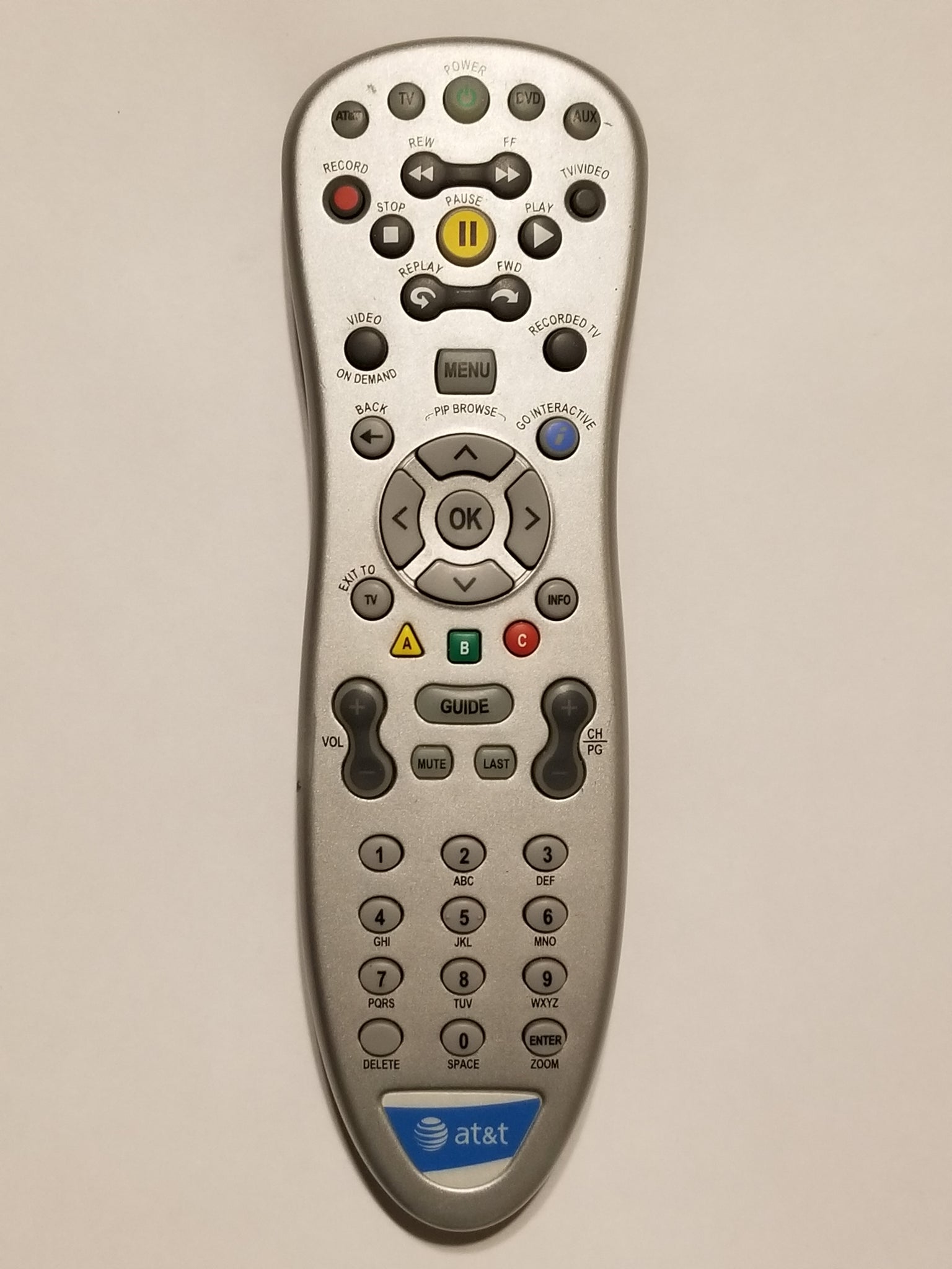 This RC1534803/00 AT&T U-verse replacement remote control has buttons for TV, DVD, auxiliary devices, PIP (picture in picture), live tv recording, and more.