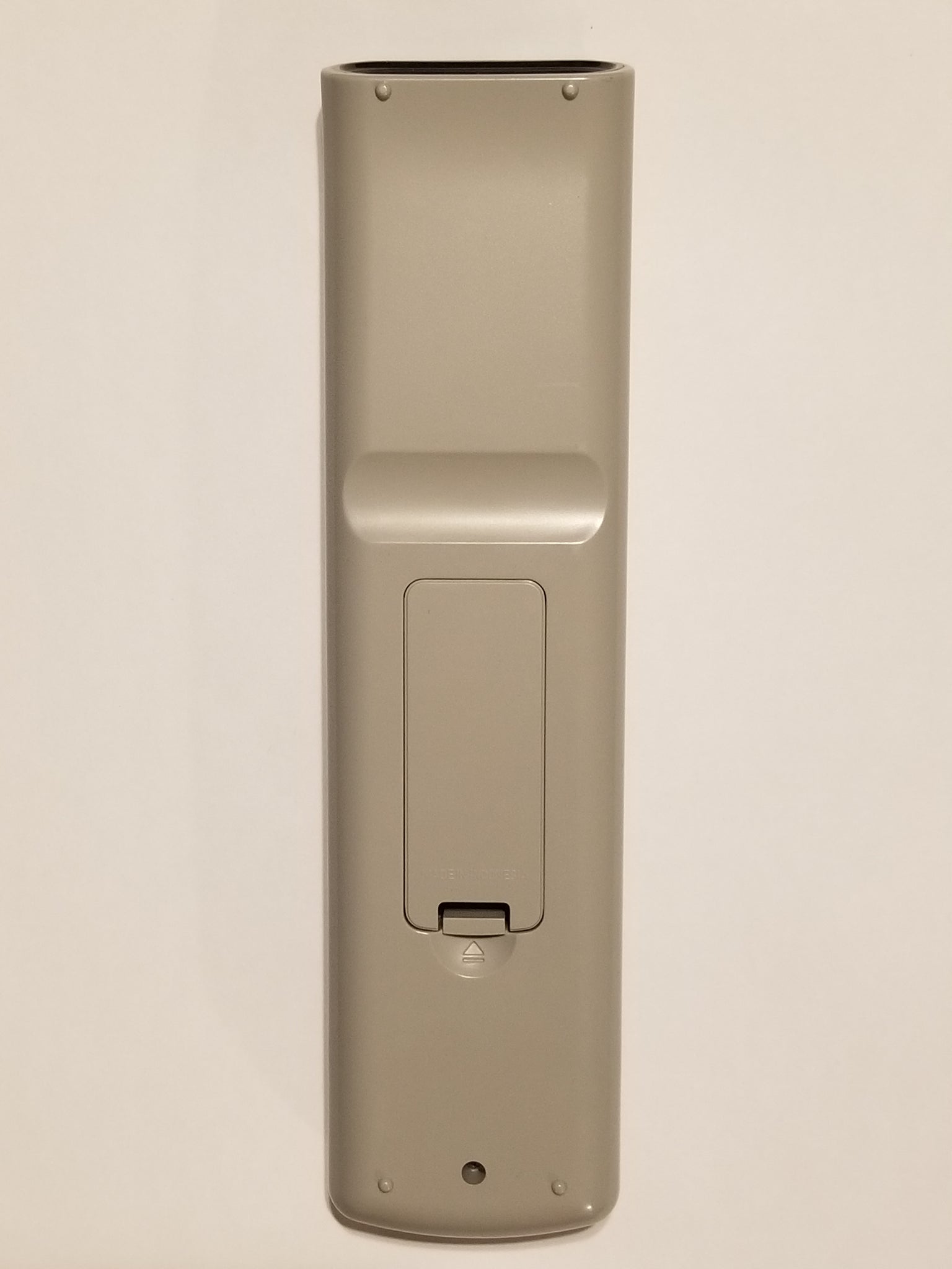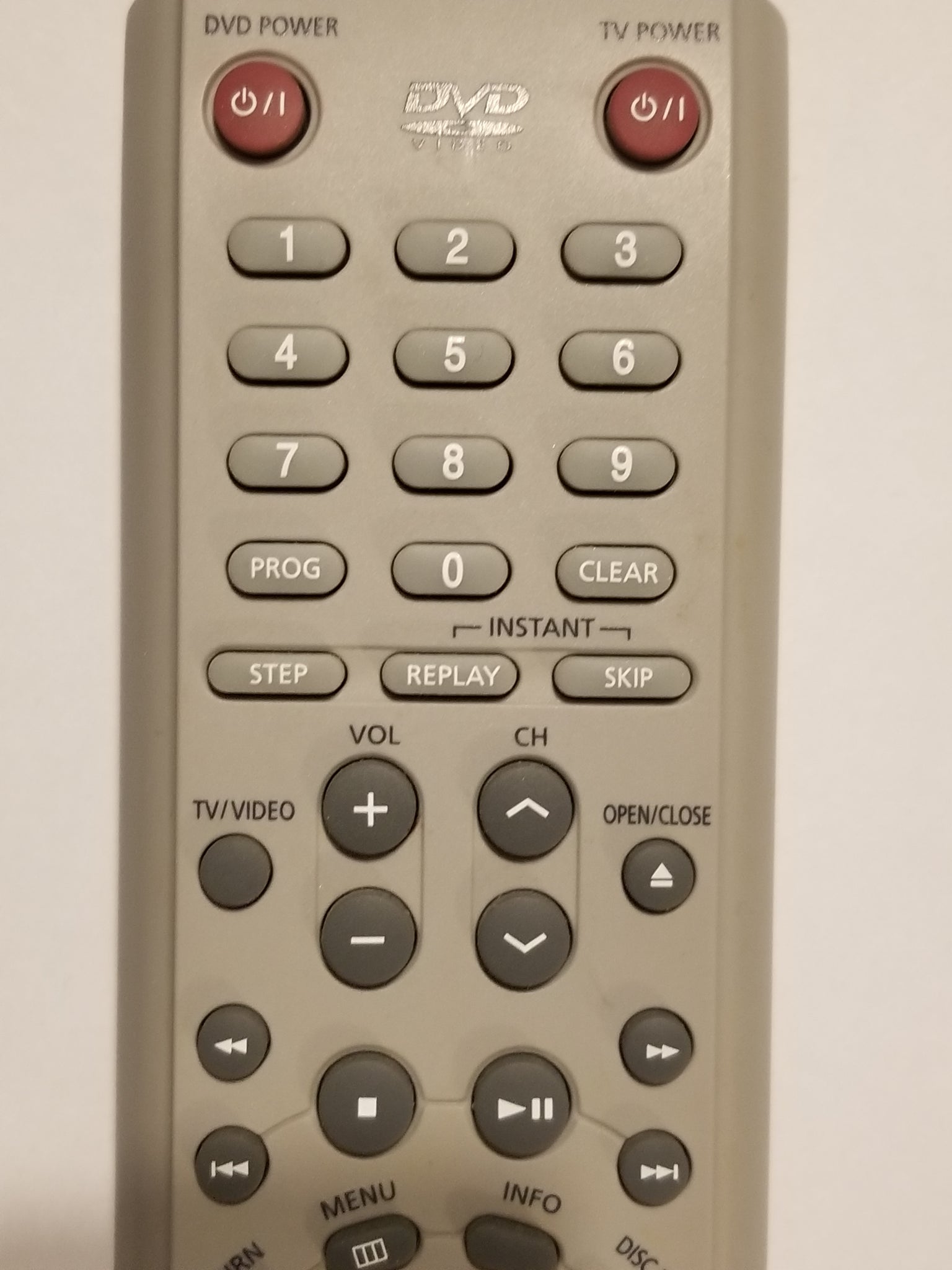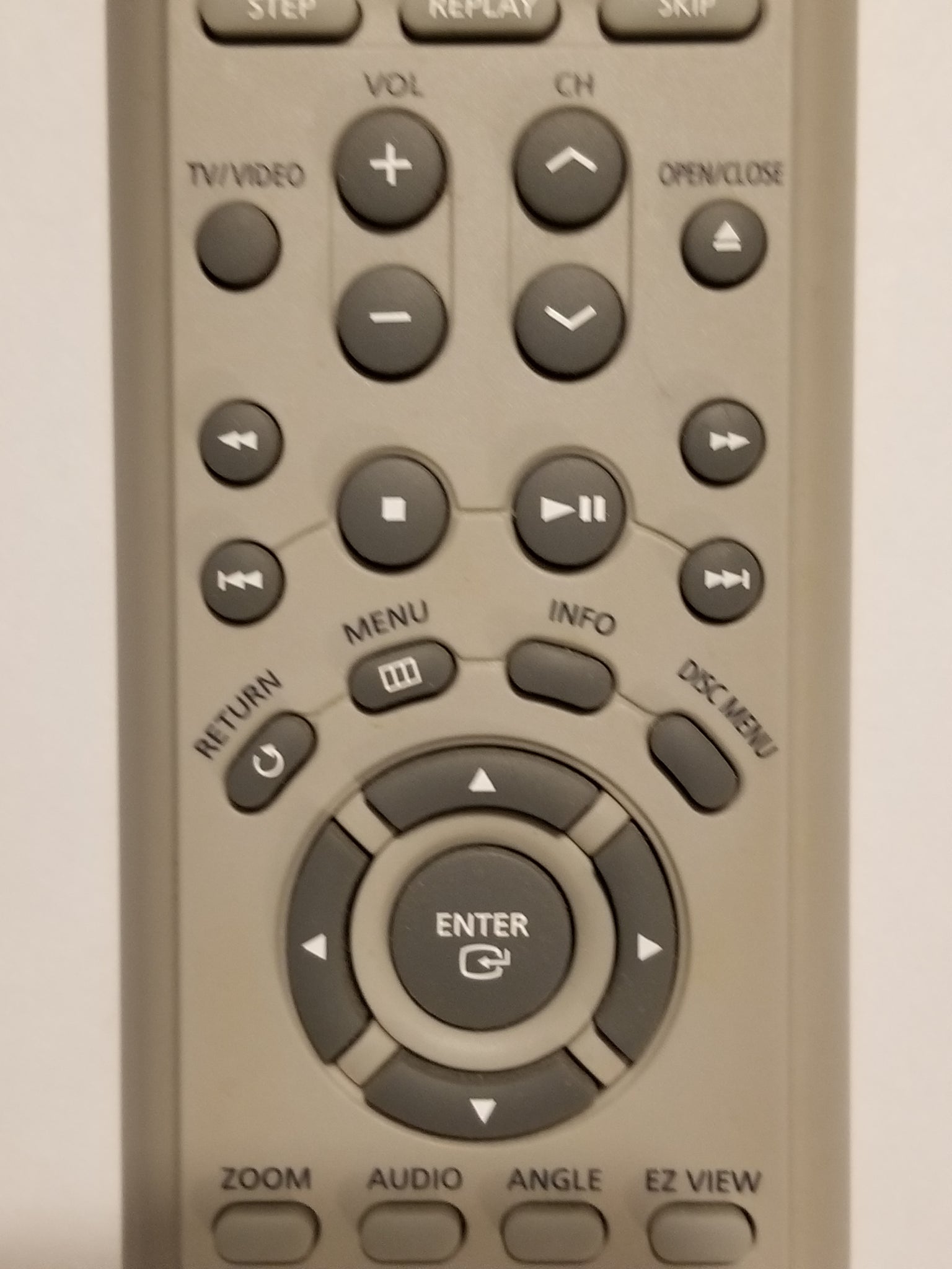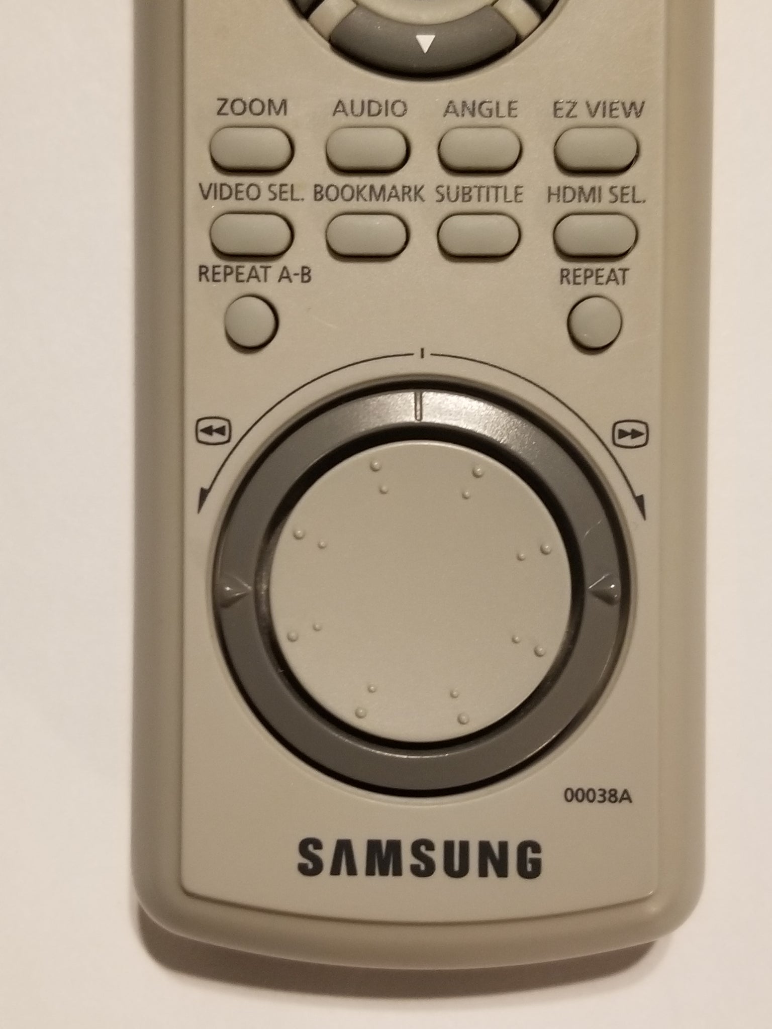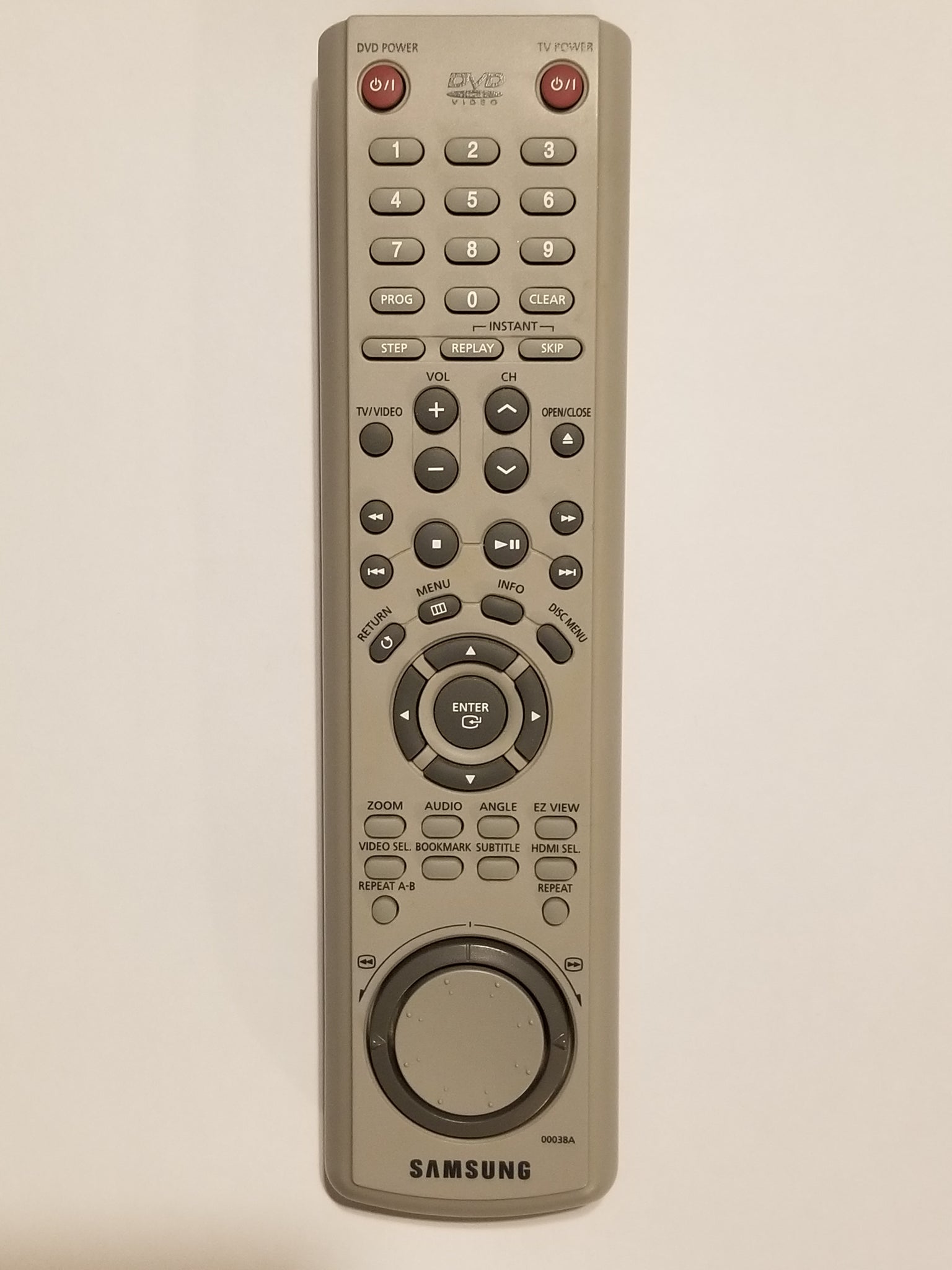 This gray Samsung 00038A DVD player remote has buttons for elite Samsung features such as the nested scroll wheel bookmark, instant replay and instant skip.