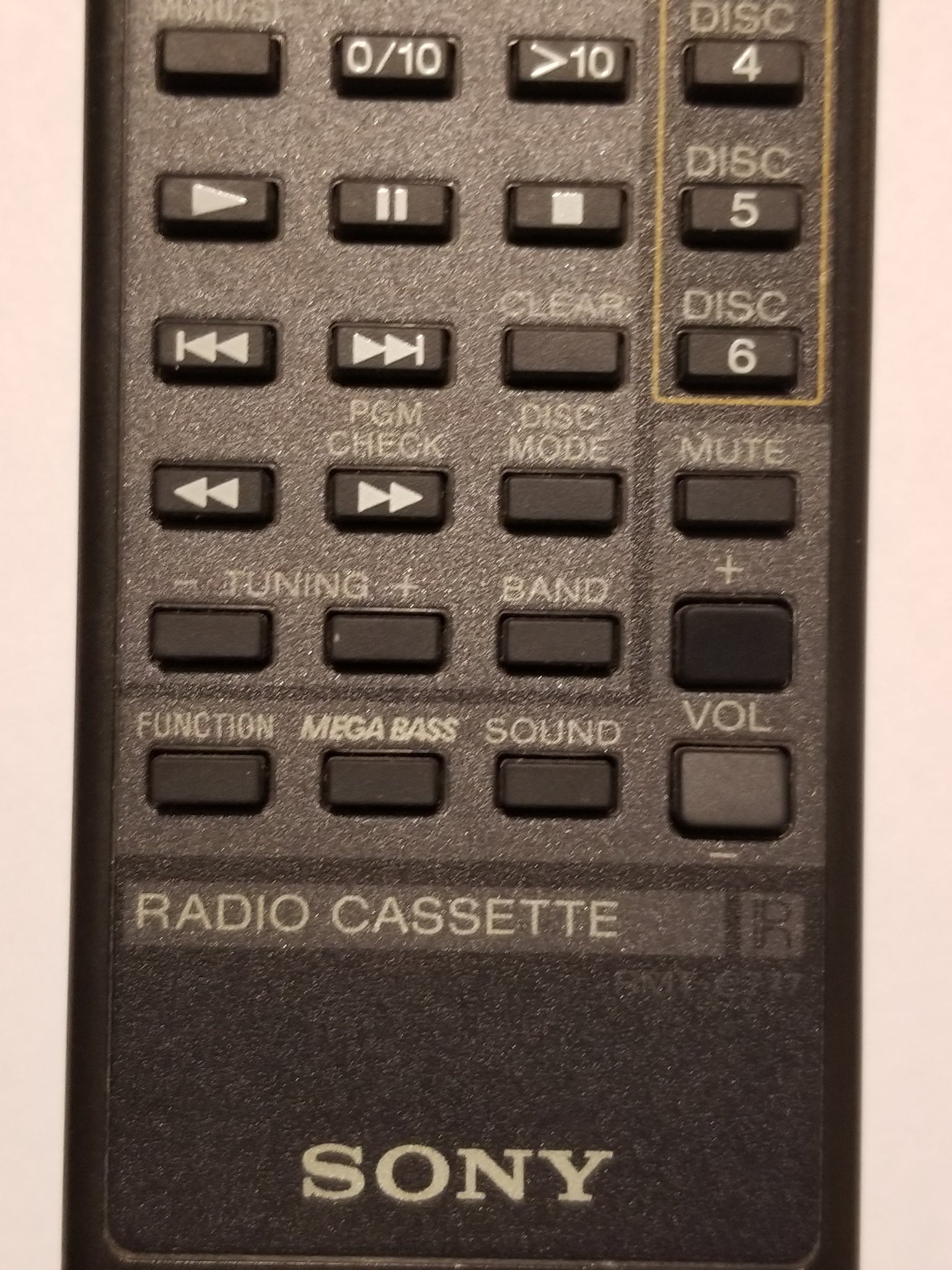 This RMT-C777 SONY remote control operates a CD player with changer, radio, cassette tape player, and stereo system.
